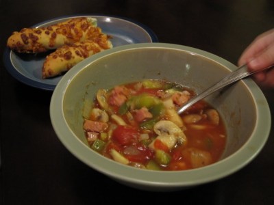 I served this with cheese-bread sticks as it seemed to go with the pizza theme. Cole liked helping to prepare and serve the soup (and even acted as a hand model in my photo, as you can see), but didn’t seem to enjoy the eating of the soup so much. I don’t think he was very hungry because he didn’t do much justice to his cheese-bread either, and usually he likes that a lot. Bennett wasn’t overly interested either. I guess it was just an ‘off’ day. I ate all mine and enjoyed dipping my bread in it. I packed some in their lunches the following day and it was all gone when they came home so I’m assuming they liked it. I had some the next day for lunch as well and found that the flavour had improved overnight. It reminded me a lot of minstrone soup, but without beans and pasta. I think I prefer minstrone actually, but this soup certainly wasn’t bad.