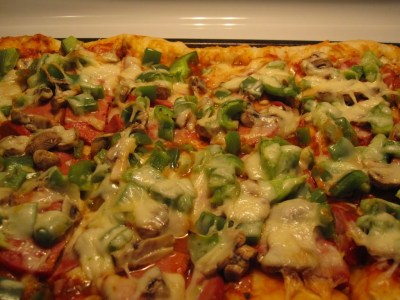 I got this advice from a friend: sprinkle your pizza crust with ground flaxseed before you bake it, for extra nutrition. You can get ground flaxseed in a box and keep it in the fridge. You can also put it in things like spaghetti sauce and chili.
