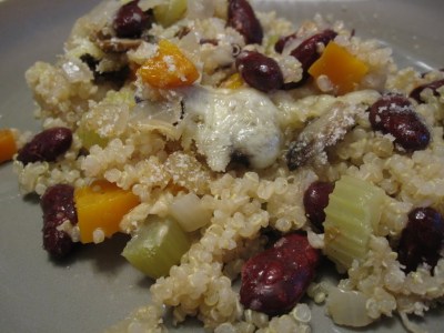 Add olive oil to a large non-stick frying pan over mdium heat. Add celery, carrots and onion, stirring for 3-4 minutes. Add mushrooms and cumin, cook until veggies are tender. Stir in broth, quinoa, beans, 1 cup of cheddar. Place in a greased casserole dish. Cover and bake for 45 minutes at 350F. Sprinkle with breadcrumbs and remaining 1/2 cup of cheese. Bake uncovered, for 15-20 minutes, until liquid is completely absorbed and cheese has melted.