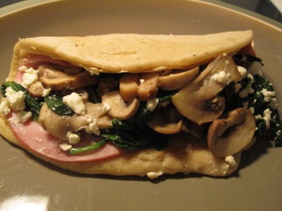 Place meat slices on top of the pancake, then mushrooms and spinach, then sprinkle with feta. Fold the pancake in half.