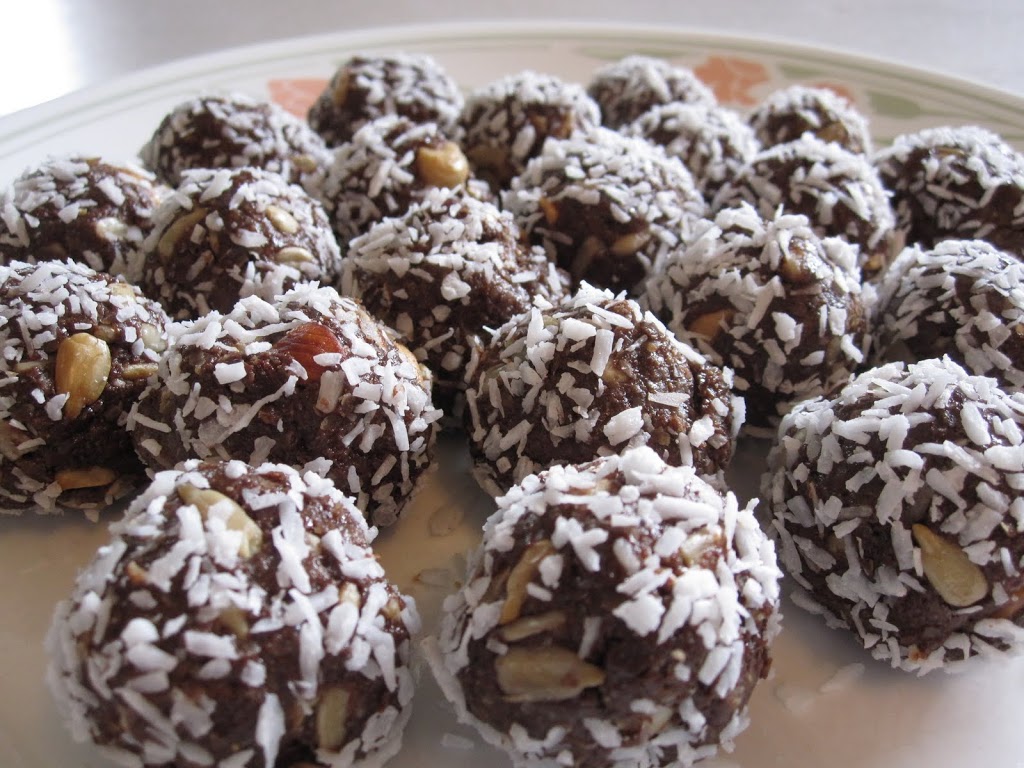 Combine all the ingredients except the coconut. For mixture into balls. Place coconut on a plate and roll balls until coated.