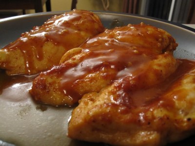 Preheat to 400F. Place chicken in a greased baking pan (I like to line it with tin foil for easy cleanup). Whisk together BBQ sauce, soy sauce, mustard, honey, lemon juice, garlic and chili powder. Pour evenly over the chicken. Bake, uncovered, for 35-40 minutes, until chicken is cooked through. Set chicken aside and pour sauce into a saucepan. Mix cornstarch with 2 tsp water then add it to the sauce. Bring to a boil and whisk constantly until mixture has thickened. Pour it back over the chicken.