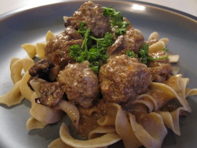 I ended up cooking this for more like 8 hours because we had a change of plans and went out for dinner. We ate it the following night instead. The meatballs were a bit soft but tasted good, or at least I thought so. The boys didn’t really like it, and Tony was working nights and i don’t think he grabbed any for leftovers because it sat in the fridge for a while. I tried using it in hamburger buns, kind of like a sloppy joe, but the kids didn’t fall for that either. It really wasn’t a bad meal but I guess it just wasn’t to my family’s liking. My parents, however, really like this! They agreed that the nutmeg and allspice were a nice and unexpected touch that made this dish special.