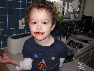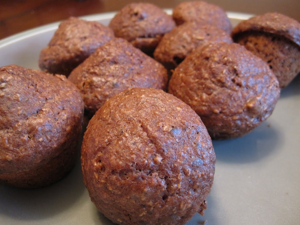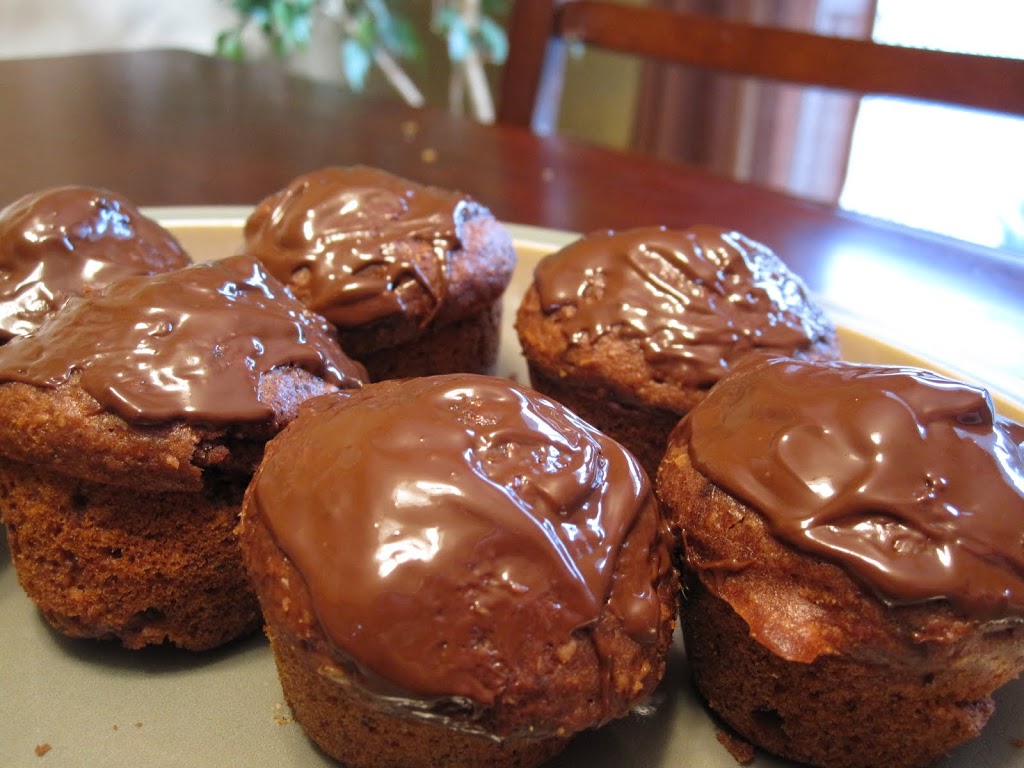 Cole had been bugging me to make chocolate muffins for the longest time. I don’t know where he got the idea from, but he was determined that I was going to make them for him. So finally I caved and whipped up these muffins. I tried to make them somewhat nutritious by using bran and cut down on the refined sugar by using apple juice. They tasted alright, but a little boring. Chocolate chips probably would have helped but I didn’t have any. So Cole suggested chocolate on top of them. I happened to have a bar of dark chocolate, so I microwaved a few squares and spread it on top of the muffins. Then they looked like this: