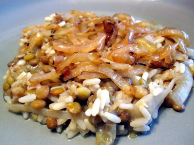 A Middle Eastern dish with lentils, rice and carmelized onions.