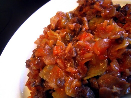Brown beef, onions, garlic. Add crushed tomatoes, water, and soup and bring to boil. Add rice, salt, pepper, nutmeg and worchestershire sauce. Reduce heat, cover and simmer for 20 minutes. Place half of shredded cabbage in a greased baking dish. Cover with half the rice mixture. Repeat layers. Cover and bake at 350 for an hour.