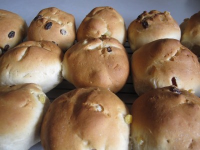 This is a recipe for hot cross buns from my godmother, Jean, who passed it on to my mom, who has passed it on to me. Every year at Easter time my mom makes these buns and we would usually eat the entire batch in one day. They’re just so good you can’t stop eating them!
