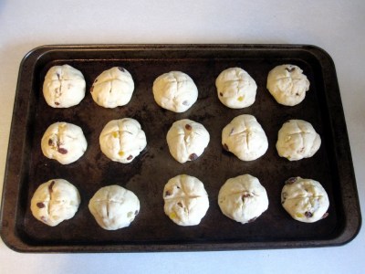 Punch the dough down. Form buns with approximately 1/3 cup portions of dough.(Remember they double in size so make them smaller or larger as you wish). Place on a greased cookie sheet giving room for them to expand. ( you should be able to get the whole batch on one large cookie sheet) Cut an X in the top of each bun with a sharp knife if you wish to do so.