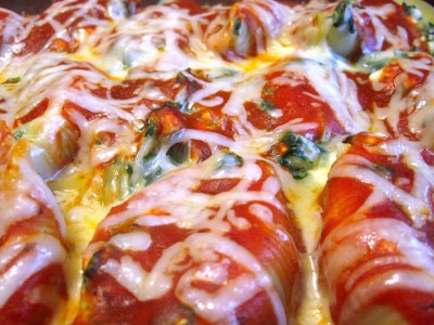 Jumbo pasta shells stuffed with cottage cheese and spinach.