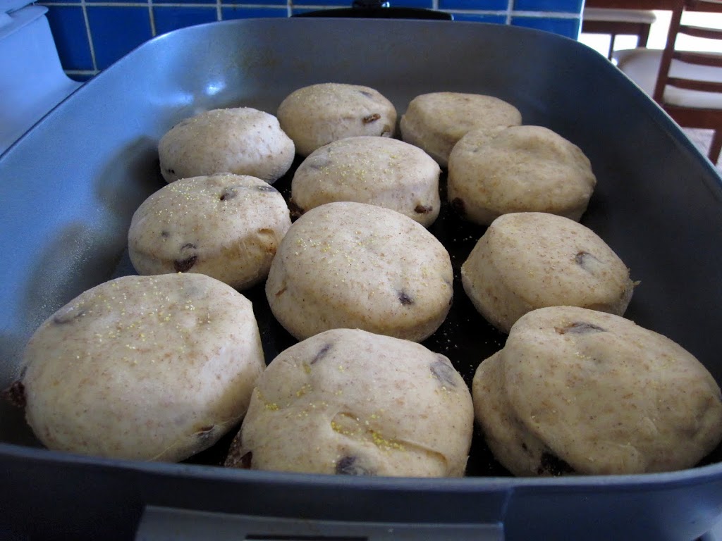 Heat milk in the microwave for 1-2 minutes, until hot enough to melt butter. Add honey, butter, and salt to milk. Let cool to lukewarm. Dissolve yeast in warm water. Let it sit while you mix together whole wheat flour, 2 cups of all-purpose flour, cinnamon, raisins and sugar in a large bowl. Add water/yeast to milk mixture, then pour into the bowl of flour and stir until smooth. Gradually add more flour until soft dough forms. Place dough on a floured surface and knead for about 10 minutes, adding more flour as needed. Place in a greased bowl, turning the dough over to grease the top of it. Cover with a dishcloth and place in the oven with just the pilot light on.  Leave it to rise for 1 hour.