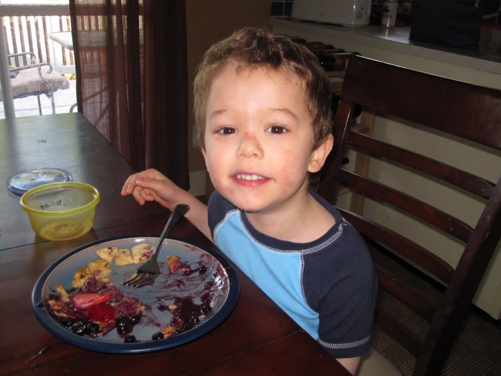 My boys loved this breakfast! I usually put bananas and blueberries inside the pancakes and then pour syrup over them, but I made this sauce so we don’t have to use as much syrup and they liked it even better. This recipe makes a lot of pancakes, about a dozen of them. We obviously didn’t eat all of them since there were only three of us (Tony was working), so I froze them to enjoy as snacks later by popping them in the toaster. We did eat all the sauce though, so if you are serving this to more than three people you might want to make more sauce! Well enough from me, I’ll let these photos speak for themselves.