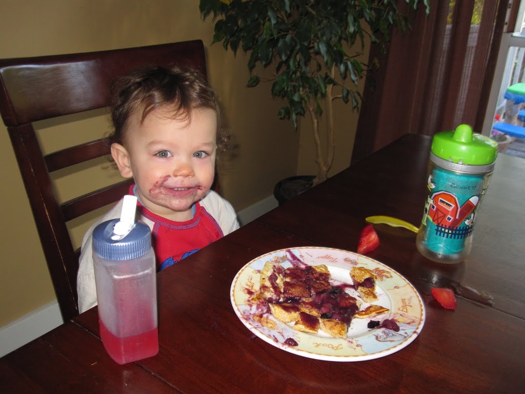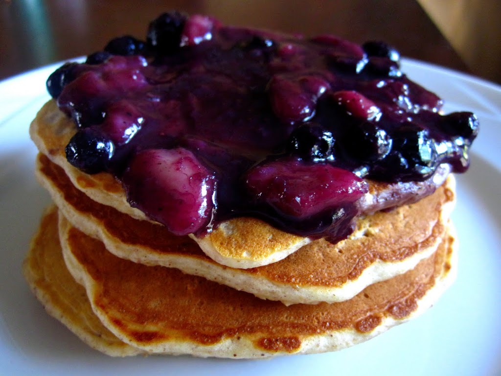 My boys loved this breakfast! I usually put bananas and blueberries inside the pancakes and then pour syrup over them, but I made this sauce so we don’t have to use as much syrup and they liked it even better. This recipe makes a lot of pancakes, about a dozen of them. We obviously didn’t eat all of them since there were only three of us (Tony was working), so I froze them to enjoy as snacks later by popping them in the toaster. We did eat all the sauce though, so if you are serving this to more than three people you might want to make more sauce! Well enough from me, I’ll let these photos speak for themselves.