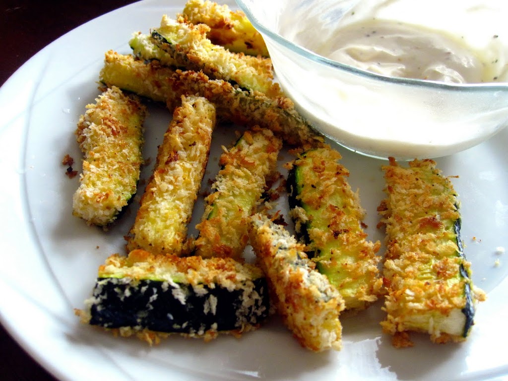 Cut zucchini into sticks, careful not to make them too thin or they will get mushy when baked. Lightly beat eggs in one bowl, then combine remaining ingredients in another bowl. Dip zucchini into eggs first, then coat with breadcrumb mixture. Place zucchini on a baking sheet sprayed with cooking spray. Bake at 400F for 10-15 minutes, turning once.