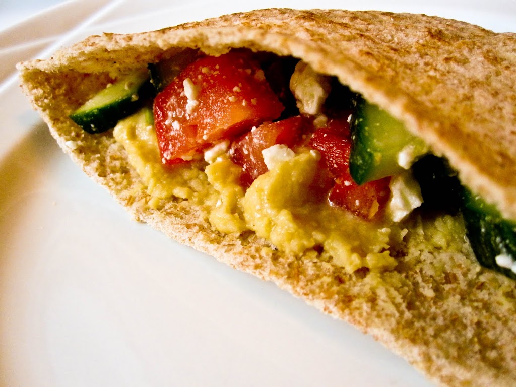 Combine cucumber, tomatoes, feta, oregano and lemon juice. Cut pitas in half and spread with hummus, then fill with the greek salad mixture.