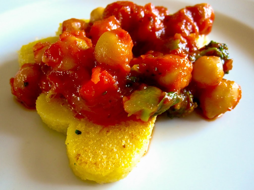 A wholesome tomato sauce with chickpeas, broccoli and red peppers served over fun heart-shaped polenta.