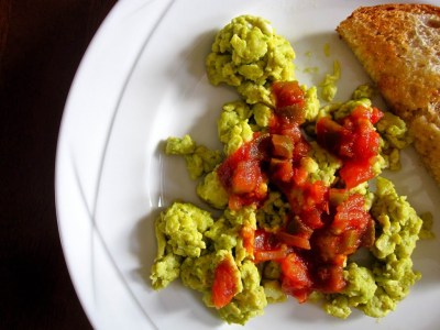Avocado gives these scrambled eggs a rich and creamy texture, and a fun green colour.