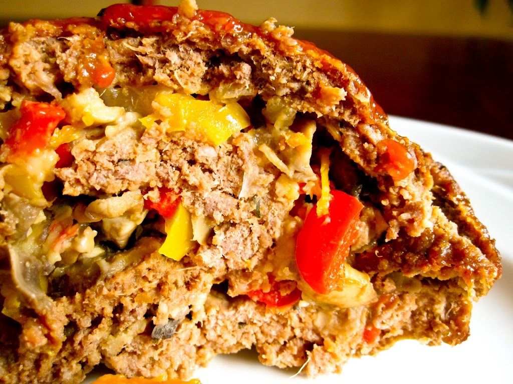 One a large sheet of waxed paper, form meat mixture into a 10×12-inch rectangle. Make sure edges are nice and straight, not jagged. Spread reserved vegetable filling over meat, leaving a 1/2-inch border. Sprinkle with cheese. Roll up meat load from the shorter (10-inch) end, lifting the waxed paper to help get it started. Roll it as tightly as possible. Pinch seam closed.