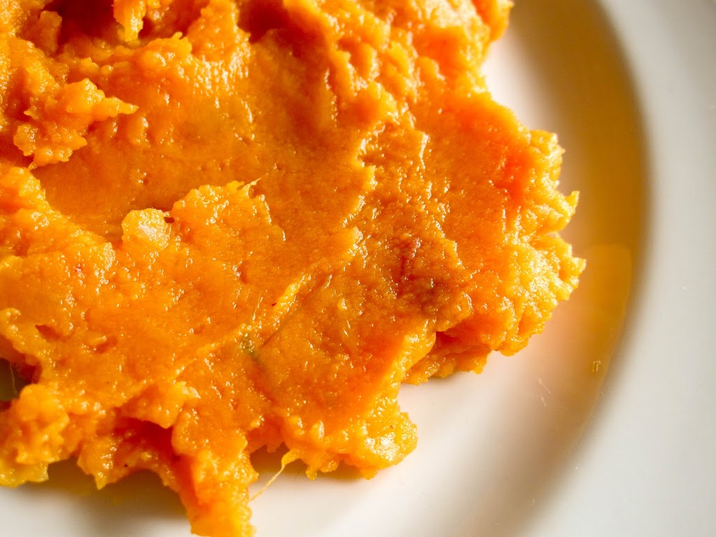 Peel and cut yams into chunks. Place in a dutch oven and cover with cold water. Bring water to a boil, then reduce heat and simmer covered for 20 minutes or until yams are soft. Drain the yams and reserve about a cup of the water. Mash the yams, then add butter, spices and balsamic vinegar. Add the reserved water as needed to moisten the yams.
