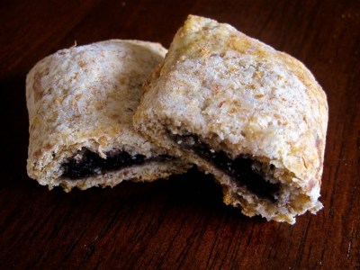 While the filling cools, make your dough. Combine flour, baking powder, sugar, flax, wheat germ and salt in a large bowl. Using a pastry cutter, cut in butter utnil mixture resembles coarse crumbs. Stir in milk and form a ball with the dough. Add more flour as necessary if it’s too sticky. On a floured surface, take half the dough at a time and roll it out into a rectangular shape with about 1/8″ thickness. Cut the dough into long strips with about a 3″ width. Spread a thin layer of filling down the centre of the strips. Fold the strips over and seal the edges shut. Cut the strips into 3″ bars. Place on a lightly greased baking sheet at bake at 350F for 16-18 minutes.