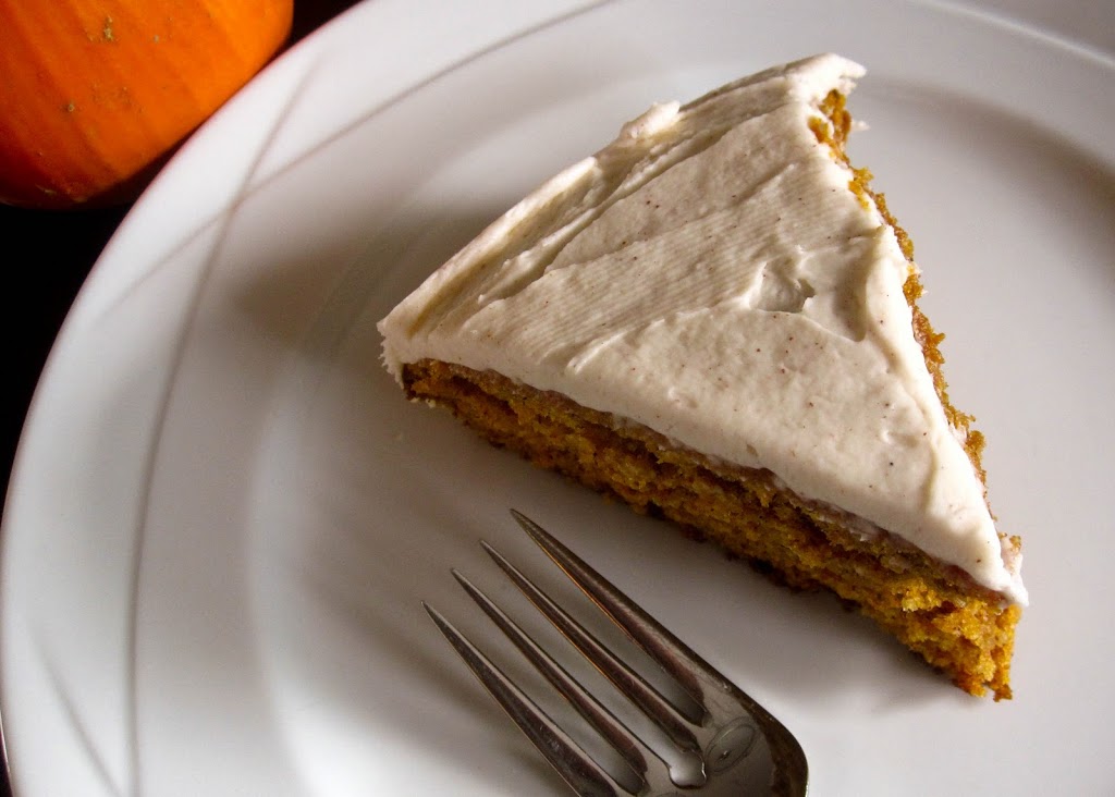 Pumpkin cake made with healthy wheat germ, flax and whole wheat flour, topped with cinnamon cream cheese frosting.