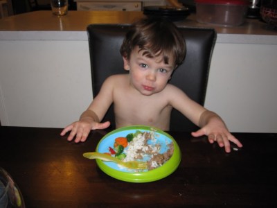 The combination of ingredients may sound odd, but trust me on this one, the flavours work together. Tony was especially impressed with these meatballs. Well either that or he was just trying to convince Cole to eat them. After a lot of Tony’s gushing about the food, Cole finally tried a bite. He wasn’t overly thrilled but he did eat a few more bites. Bennett ate most of his dinner, which was great, except for one little thing…he ate without his clothes on.
