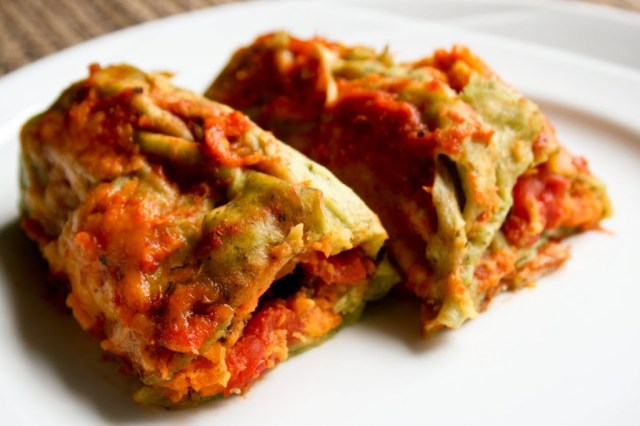 In two 9×12″ baking dishes, spread just enough red sauce to cover the bottom of the dishes.