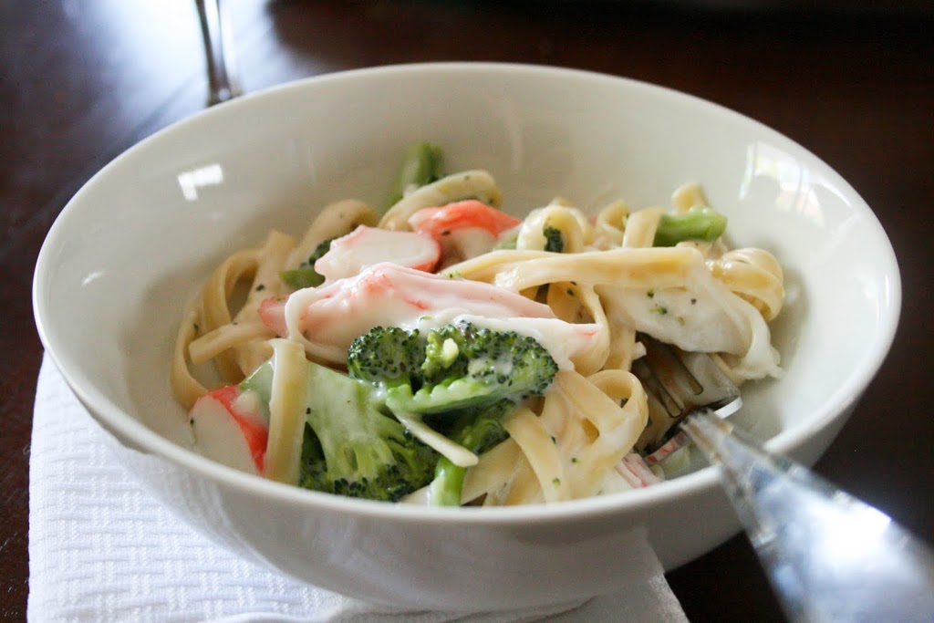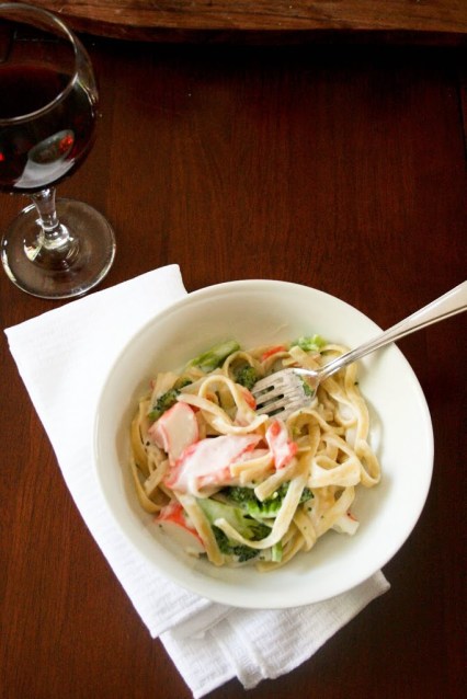 This dish is perfect for one of these home date-nights. It’s fast and easy, but still classy enough for wine and candlelight. You can change the vegetable or seafood to whatever you like. I happened to use imitation crab this particular time, which I know isn’t that healthy but it is cheap and fast so don’t judge me. Shrimp, scallops, canned baby clams, or even tuna would be great as well.
