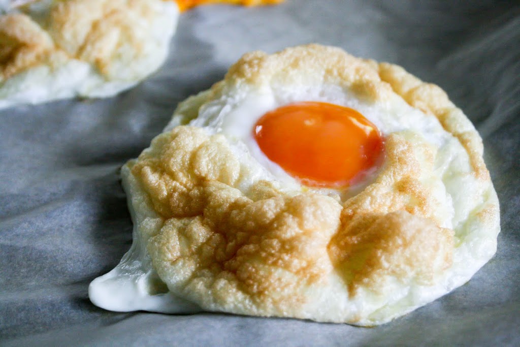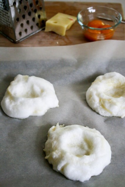 Preheat over to 450F. Line a baking sheet with parchment paper. Separate the egg whites from the yolks. Place each yolk in a separate bowl to prevent them from breaking when you add them later (I missed this step and broke one of the yolks. I really need to learn to read directions more carefully!). Place egg whites and salt in a large mixing bowl and beat with an electric mixer until stiff peaks form. Fold in cheese very gently. Spoon onto the parchment lined baking sheet to form mounds and use the back of the spoon to push down the center to make a ‘nest’ for the yolk.