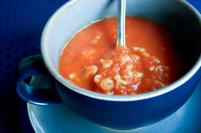 Remove tomato sauce from heat. Using an immersion blender, blend the sauce until fairly smooth (you can skip this part if you’d rather have it chunky). Stir in the cooked alphabet noodles, cheese, and salt and pepper. Stir until cheese has melted through.