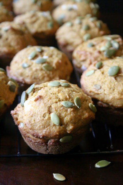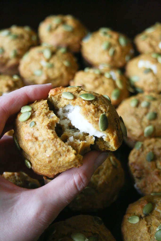 In greased muffin tins, fill half-full with batter. Add spoonfuls of cream cheese mixture in the center of each muffin. Then top with remaining batter to completely cover the filling. Spinkle with pepitas.