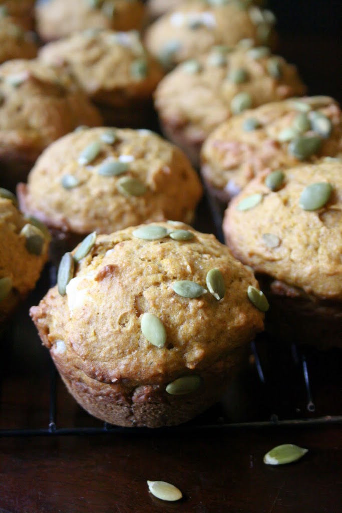 I know the blogosphere is not short on pumpkin cream cheese muffin recipes, but I happen to think this one is too good not to post. The filling is a little different than other recipes I’ve seen in that it has marshmallow creme instead of icing sugar. I think it makes a fluffier filling that tastes incredible, and it’s so easy to make wih only two ingredients. You’ll probably have some filling left over, and you’ll be glad you do because it makes the best fruit dip ever. I actually first made it as fruit dip for a party and had some left so I put it in a muffin. That’s how these muffins were born. Usually my family doesn’t really care for muffins; I’ll make a batch and no one ever finishes them all. I end up freezing the rest for later but the only person who seems to eat them is me. This time they had no problem polishing them all off. Tony likes them better than the Starbucks ones because he finds those more crumbly and have way too much cream cheese in them sometimes. When you make them yourself you can adjust the amount of filling to you preference. I used about half a tablespoon in each muffin, but if you really like the filling feel free to put more than that. There should be plenty of filling to do play around with the amounts if you want. I love the pepitas sprinkled on top (an idea I stole from the Starbucks version). It just makes them a little more interesting and lends a nice nutty flavour and crunch to them. They’re a great fall treat to enjoy with coffee or tea, and they’re also great for packing in lunches.