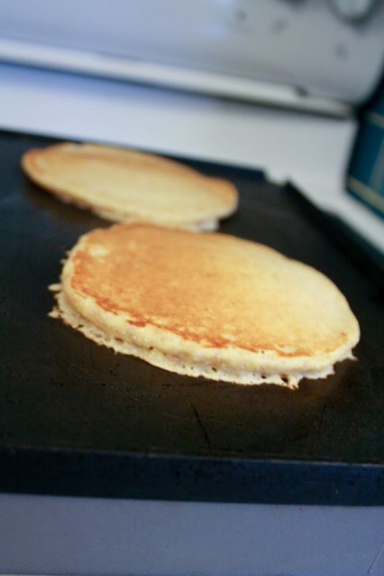 Growing up, my favourite time of the week was Saturday morning. My brother and I would race to be the first one downstairs to watch Saturday morning cartoons. Soon the smell of pancakes would waft into the room, and we’d be racing once again to get to the table for breakfast where a plate of delicious homemade pancakes would be waiting for us. I’ve carried on the tradition of pancakes on Saturday mornings in my household, and my parents still make pancakes at their house on Saturdays too. This is a recipe that they often use. I like it because it has very little oil but they’re still moist because of the applesauce, and they really stick with you all morning because of the grains. You can easily adjust them to your taste or what you have on hand. I sometimes use mashed banana in place of the applesauce. I also love to use real buttermilk to replace about half of the plain milk to make them really moist and delicious. Sometimes I like to put blueberries in them too. Give them a try and experiment with your own variations.