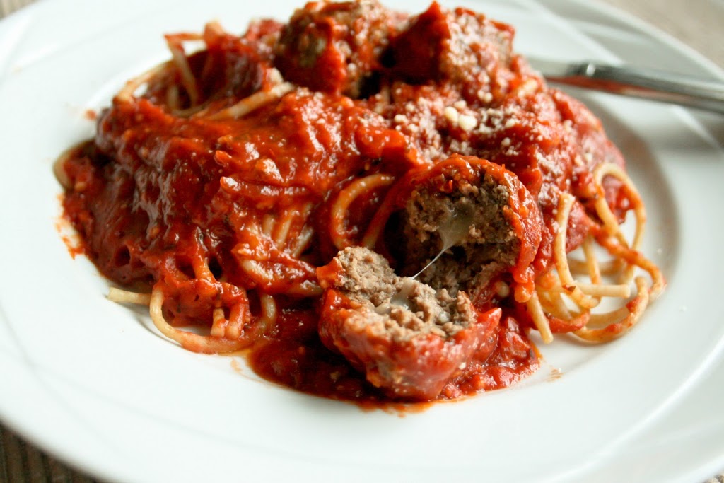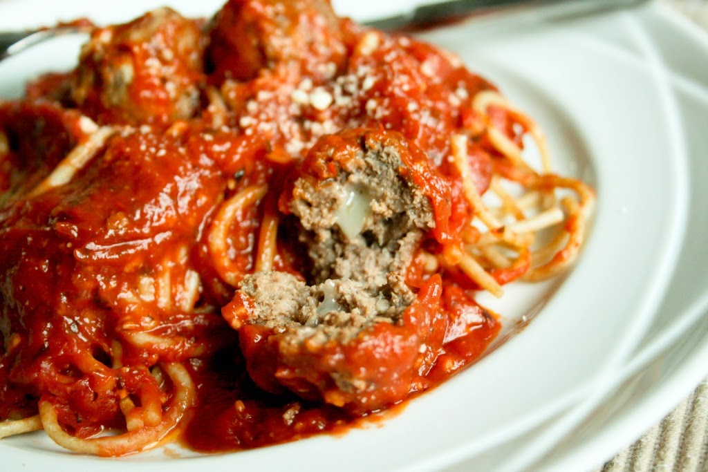 Cut cheese into 3/4″ cubes (about 18 of them) and place in freezer for at least an hour. Preheat oven at 350F. Line a baking sheet with tin foil and spray with cooking spray. In a large bowl, mix together remaining ingredients. Take cheese cubes out of the freezer. Scoop out a heaping tablespoon of the meat mixture and flatten it in the palm of your hand. Place one of the cheese cubes in the center, then gather the meat around it and form a ball. Place on baking sheet. Repeat until you’ve used up all the meat mixture. Bake for about 30-35 minutes, until meat is no longer pink inside. Serve with pasta sauce and spaghetti.