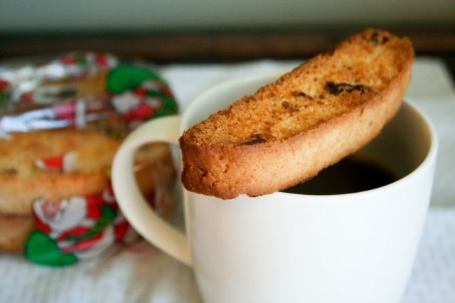 This was my first attempt at making biscotti…ever! It was fun to make and it’s great to give as a gift because it keeps well. This recipe is also nut-free so that’s good if you’re looking for a gift for someone with a nut allergy. Tony and I have been enjoying it with coffee and Bailey’s- yum! I couldn’t really taste the bananas in it, but the chocolate chips were very tasty.