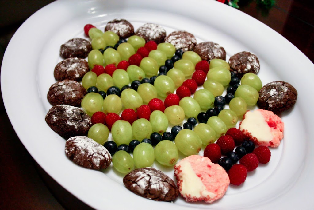 I made this for Bennett’s preschool Christmas party and I’m making it again tomorrow for Cole’s kindergarten party. It’s a fun design for kids to enjoy and it’s healthy because of the fruit. Ok, the cookies aren’t healthy, but I needed something to hold the fruit in place so they wouldn’t roll around. The cookies you see here are Deep Dark Chocolate Cookies and White Chocolate Cherry Shortbread.