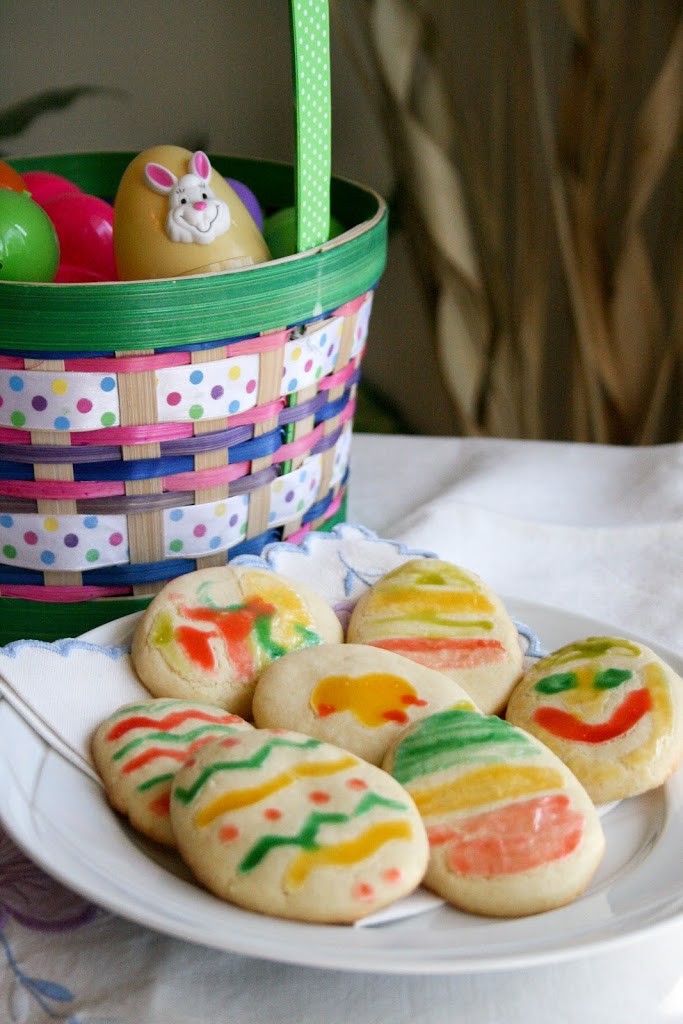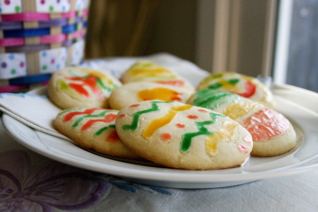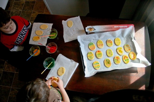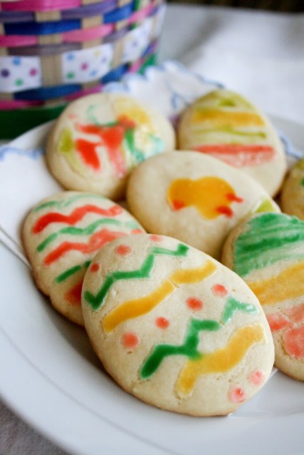 Decorate cookies by brushing egg-yolk paints onto the egg-shaped cookie dough. Place cookies onto parchment paper-lined baking sheets. Bake at 375F for 7-8 minutes, until edges are golden. Transfer to wire rack to cool.