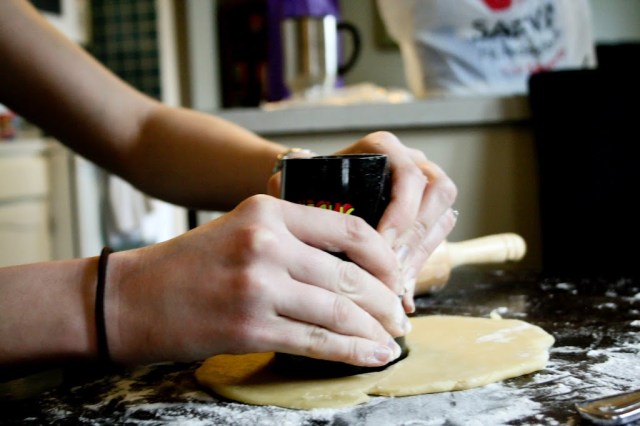I didn’t have any egg-shaped cookie-cutters, so I just used a plastic cup. It was a Spiderman cup, of course. If you’re not cool enough to own a plastic Spiderman cup, then I suppose you could use any plastic cup that is somewhat bendable. I squeezed it on both sides to form an oval shape as I pressed it down into the dough.
