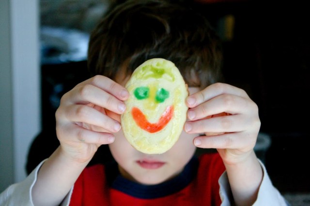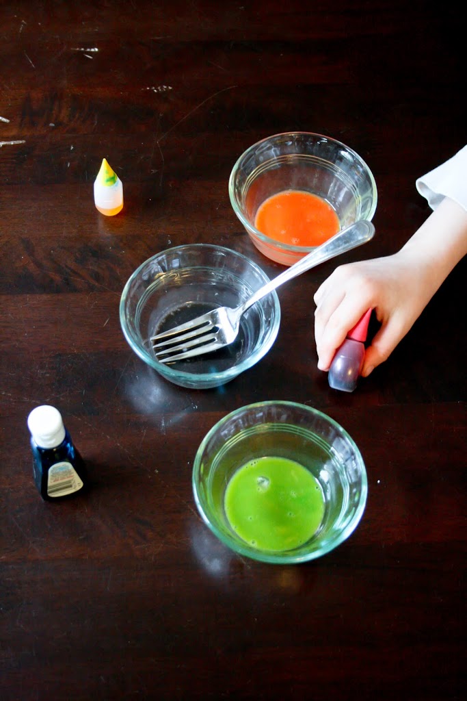 Egg yolk paint: Whisk 1 egg yolk with 1/4 tsp water. Divide into several small bowls and tint with food colouring as desired.