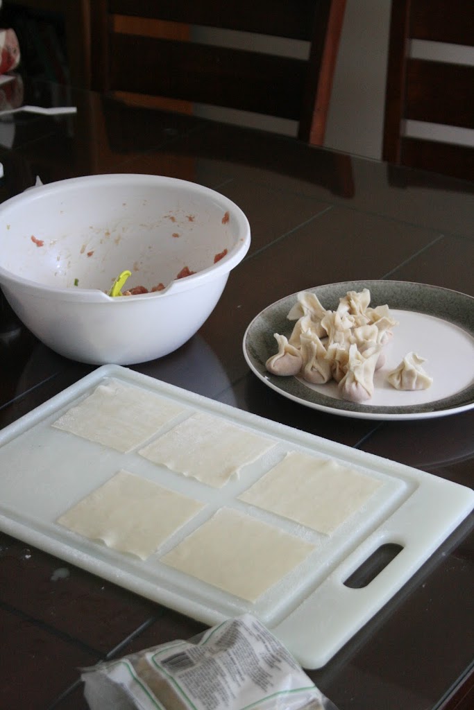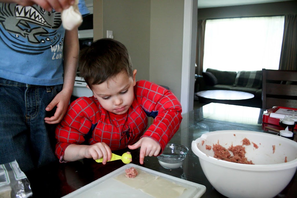I love pretty much all types of dumplings. Whether they’re wontons, gyozas, empanadas, samosas or perogies, I love biting into carblicious dough to uncover the yummy fillings hiding inside them. Not only are they fun to eat, they’re also fun to make. The kids loved helping me make these wontons for our wonton soup. It was surprisingly easy to put them together; even 3-year old Bennett managed to make a few. I had to keep a close eye on him though, because he has a habit of sticking his fingers in his mouth, which is not a good idea when handling raw meat. Also, he decided he should dress up as Spiderman while making wontons and I had to make sure he didn’t get his precious outfit messy. He likes to dress up as Spiderman in all sorts of situations, like going to the grocery store, to preschool, and playing in the backyard, so this is not an unusual scene in our house.