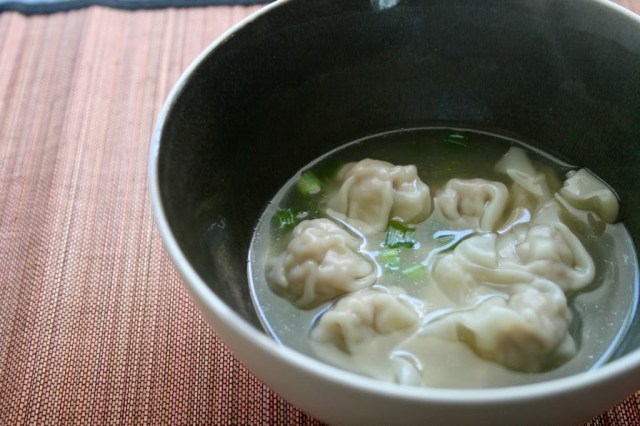 Place 1 tsp of meat mixture in the middle of a wonton wrapper. Wet the edges of the wrapper with water, then gather the ends together and squeeze them lightly to seal in the meat. Repeat until all wrappers are used. (If you have any meat mixture left over, you can fry it up and add it to the soup.)