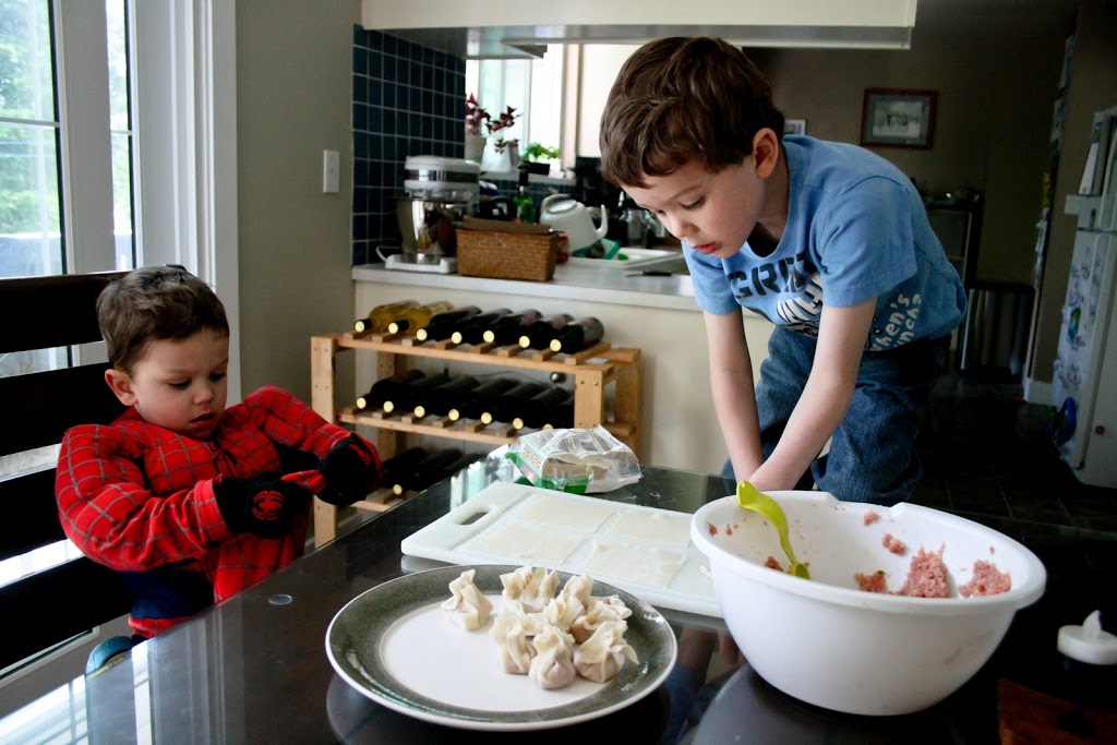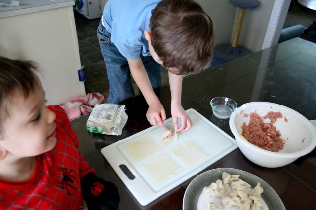 By the end we had filled up two plates with wontons. There were way too many of them for us to eat in one night, so I only used half of them for the soup and the rest I boiled and froze for later. I had extra meat too, so I fried it and added it to the soup. The kids enjoyed them, but they were a bit to big for them to eat whole so I cut them into smaller pieces. They tend to like meals more when they’ve helped make them. It took a lot longer than if I had just done it myself, but I think it’s worth it if gets them to eat their dinner. I also think it’s important for them to get involved with preparing meals at an early age. I’m hoping they’ll gain an appreciation for cooking food and will continue to do so for their own families one day. That’s my hope anyway. Whether or not it will actually happen remains to be seen, but for now I’m just enjoying quality time with my boys. They’re pretty special little guys. Heck, one of them is Spiderman!