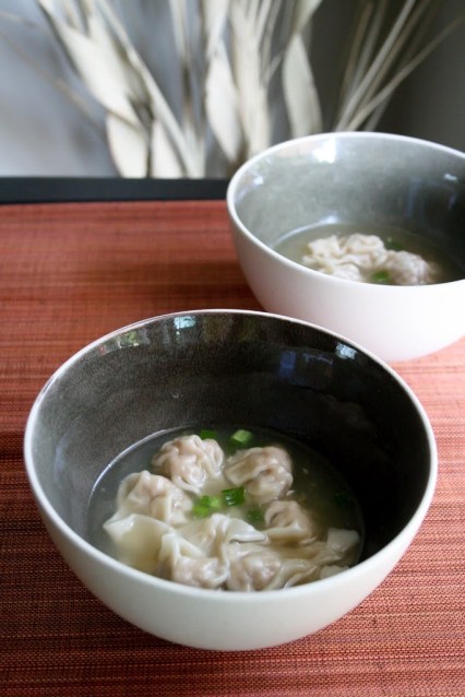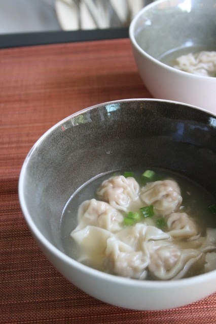 For soup, bring chicken stock to boil and drop the wontons in. Cook for about 5 minutes until meat is cooked through. Garnish with green onion.