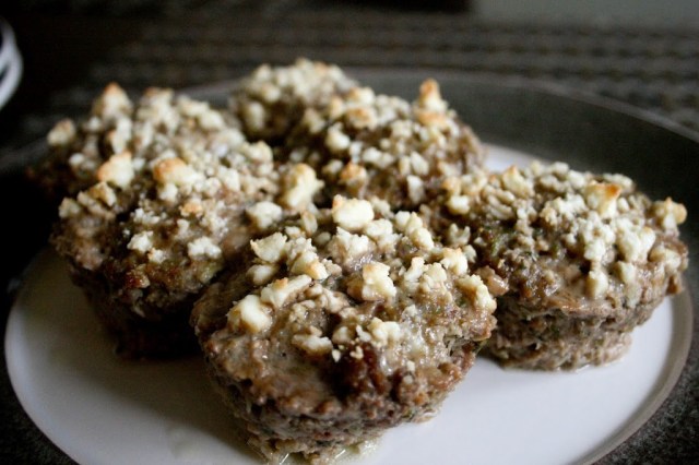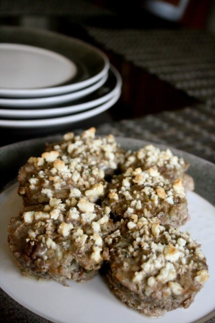 Well, enough musings from me. Let’s talk about this meatloaf. I’ve started baking all my meatloaf in muffin tins, because it cuts down on the cooking time. Plus, it’s just more fun to eat meatloaf in mini form. I love these particular ones because of the feta cheese on top and the hint of lemon, garlic and oregano that give them such a wonderful Greek taste. The food processor is a great tool for dicing up the ingredients very finely so they’re dispersed evenly in the meat. If you have fresh oregano that would be even better to add with the parsley instead of dried oregano. I have some fresh oregano growing in a pot on my patio right now, so I can’t wait to give it a try. You can do a lot of fun flavour combinations in meatloaf, which is part of why I like it. What are some of your favourite ingredients to add to meatloaf?