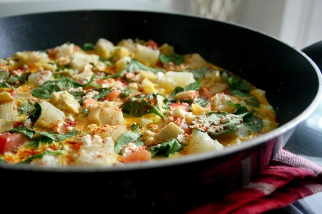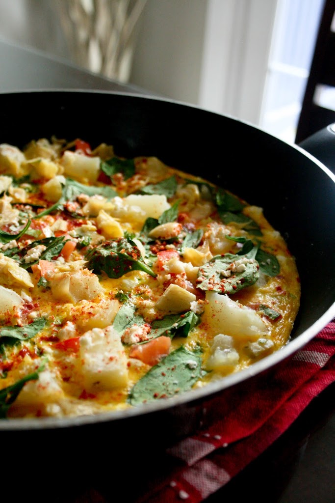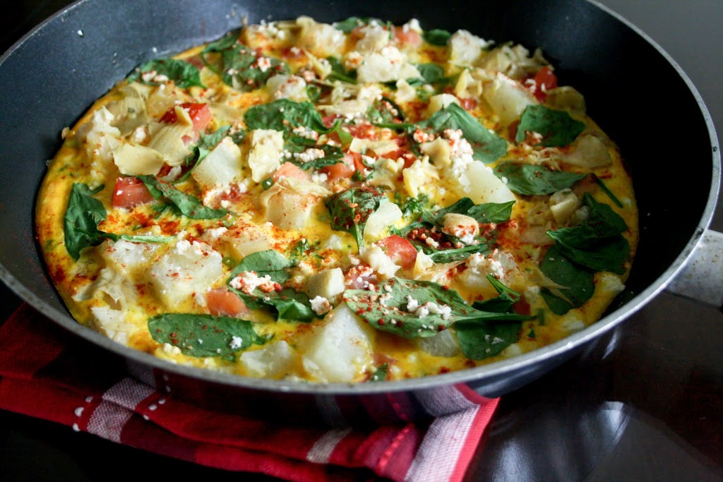Scrub potato well, poke it a few times with a fork and bake it in the microwave on high for about 5 minutes until cooked through. Chop up one half of the potato; you only need half for this recipe, so put the other half in the fridge to use later. In a small bowl, beat eggs and milk. Heat a medium ovenproof skillet over medium heat. Spray with cooking spray. Add egg mixture, then sprinkle with potato, tomato, green onion, parsley, spinace, feta, artichoke hearts, salt and smoked paprika. Cook covered for 3-4 minutes, then place under broiler for another 3 minutes, until egg is set. Cut into pie-shaped wedges.