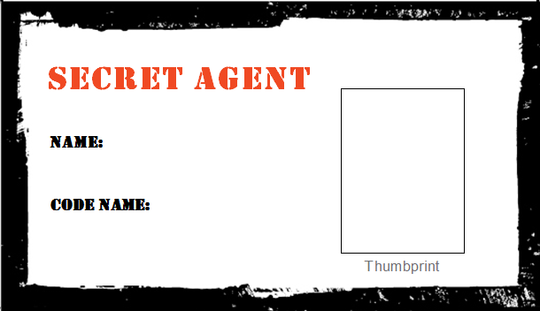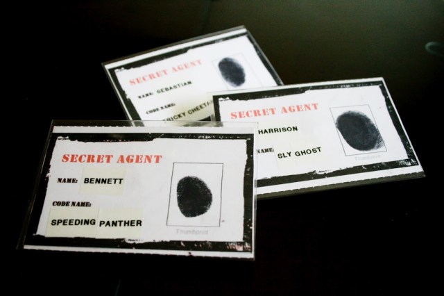 I had some crafts planned- invisible ink using baking soda and grape juice, and ID badges- but the kids were far too rambunctious to sit still very long, so I skipped the invisible ink. It wasn’t working very well for me anyway. Instead, we put on a spy movie to settle them down while Tony made balloon animals and I helped each kid individually with making an ID badge. I had done the badges up earlier with their names and then we added a code name and fingerprint. For the code names, I had a bag of labels with adjectives and another bag with nouns. They picked one from each bag and that became their code name.