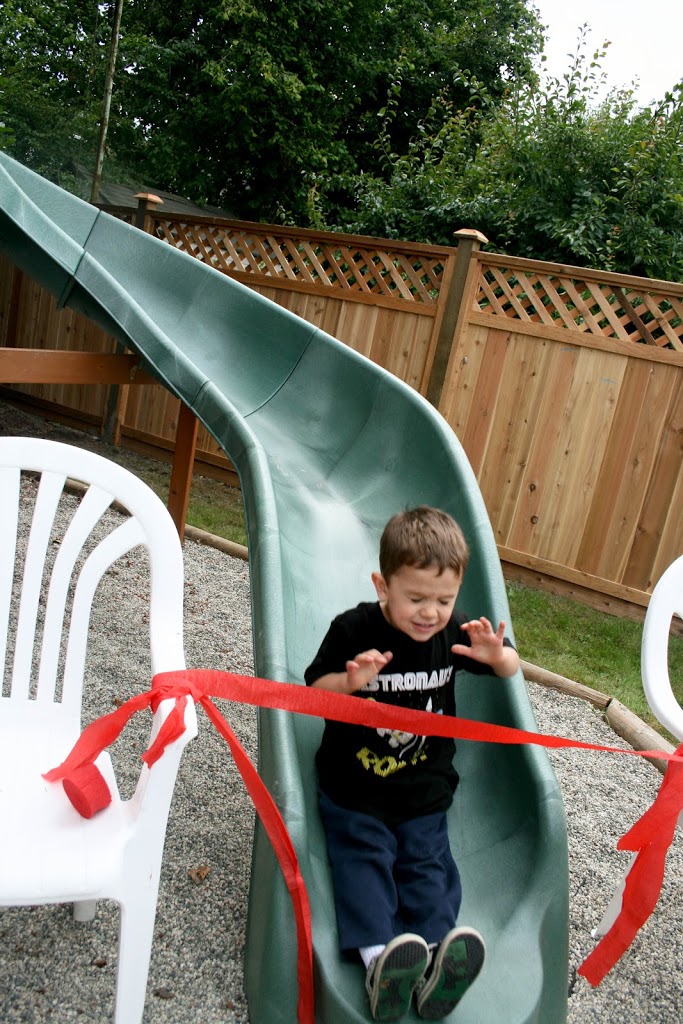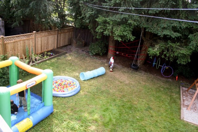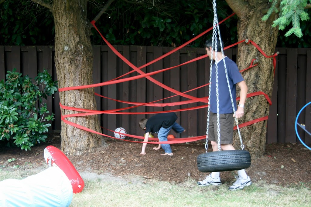 Tony set up a spy training camp in the backyard. It was an obstacle course with a bouncy castle, ball pit, tunnel, punching bags, laser maze, tire swing, hula hoops, balloon bombs, and play centre with creepy crawlies inside. We also hid plastic jewels all over the yard for them to find.