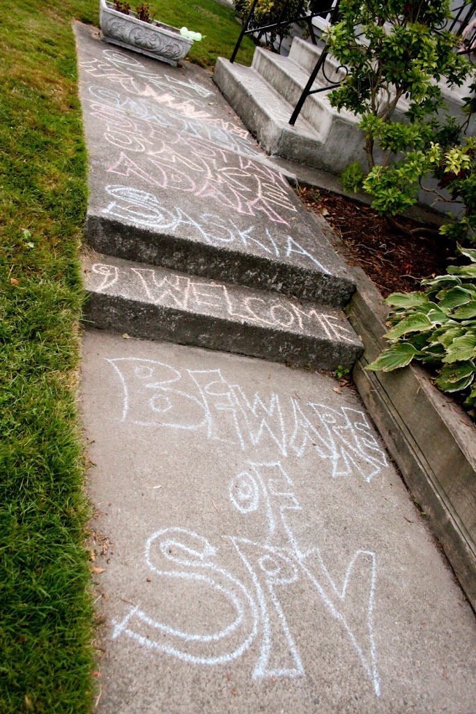 This past weekend we celebrated Cole’s 6th birthday with a spy party. He’s obsessed with spies lately from watching movies like Spy Kids and Agent Cody Banks. In fact, he’s convinced that our neighbour must be a spy because he drives a black car. He’s constantly looking for clues and codes. He told us that the number 9 is a secret spy number, so when I sent out the invitation to his party I told everyone that the password to enter was “number 9.” Cole had fun asking them all what the password was. Our very sweet tenant, who happens to be a children’s art teacher, decorated our driveway and sidewalk with chalk and included all the kids’ names who were coming to the party….and notice she even included ‘9’ in her message? Cole was thrilled! Coincidentally, there were 9 kids coming to the party.