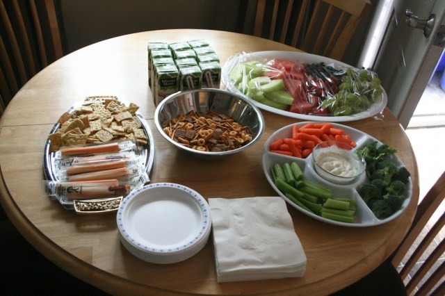 I kept the party food very simple- crackers, cheese strings, snack mix, fruit, veggies and dip, and juice boxes.