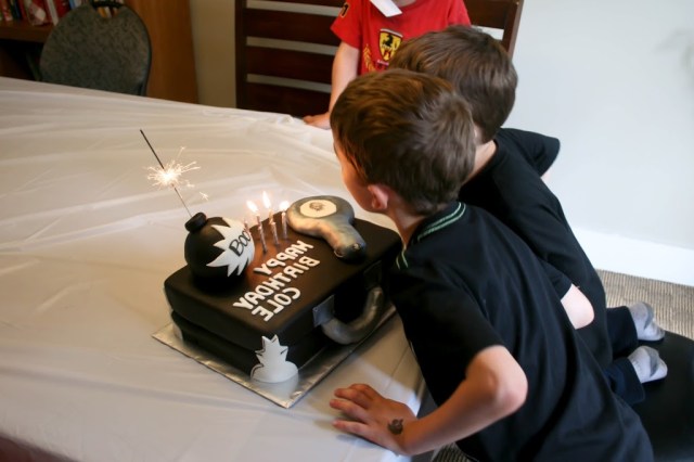 We put silver candles on the cake and a sparkler on the bomb so it looked like it was going to blow up. Luckily Cole blew it out and saved us all. That was a close one.