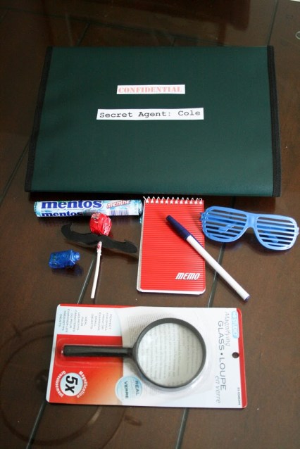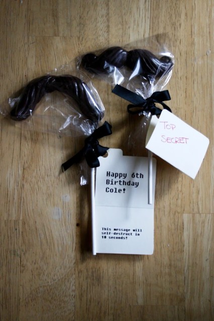 For party favours, I made up secret agent folders. Inside of them I put a magnifying glass, memo pad, pen, finger laser, mustache lollipops (from Blonde Designs Blog), glasses, and mentos. The mentos idea was from the exploding mentos in Cody Banks 2.